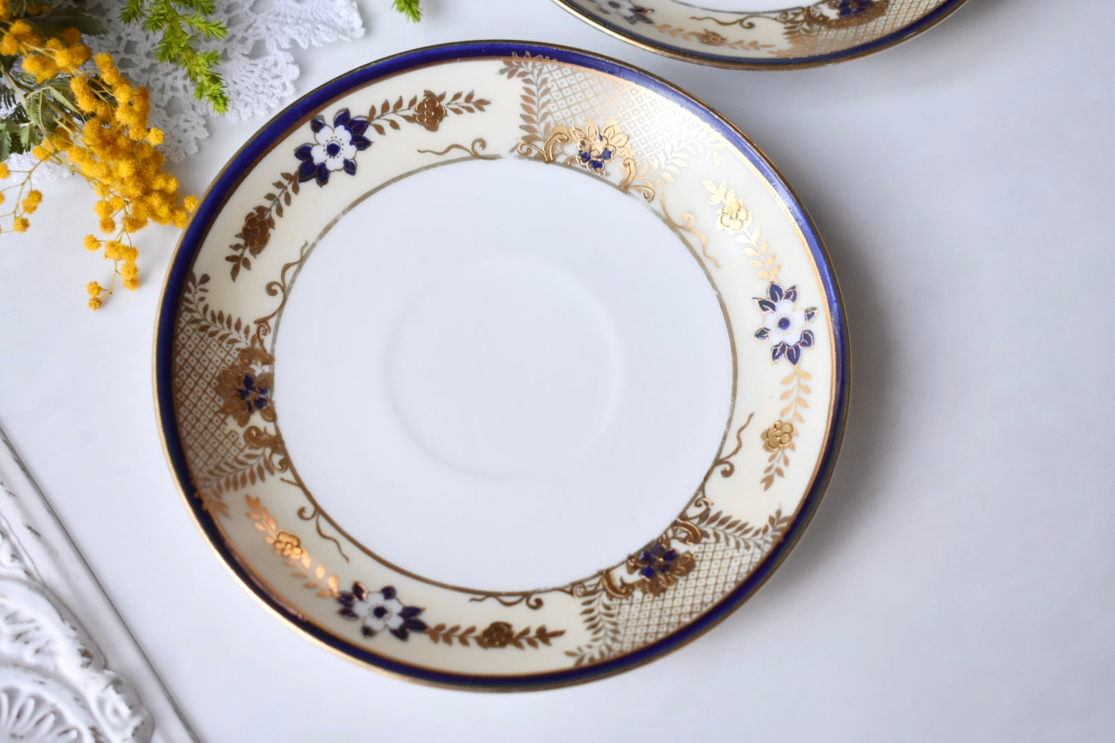 桜ようなお花がデザインされていて、ロイヤルブルーと金彩が落ち着きのある上品な印象を与えています。